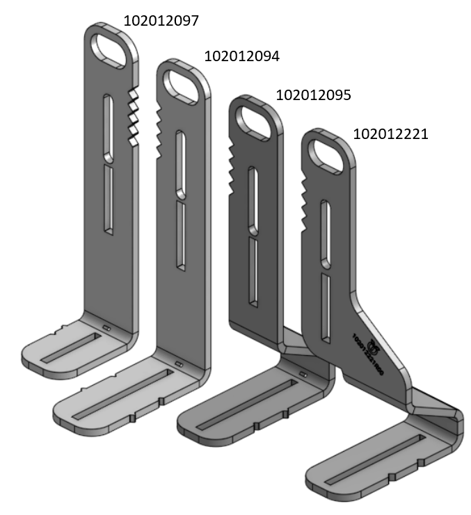 Hier sind die vier Arten von Halterungen, mit denen die Teile am Anhänger befestigt werden, mit den entsprechenden Teilenummern: