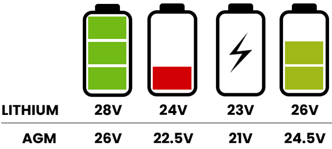 - NIVEAU DE CHARGE PLEINE (28V Lithium, 26V AGM) - Indique que les batteries sont complètement chargées et qu'aucune énergie supplémentaire ne peut être stockée.