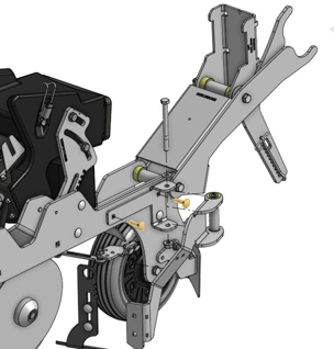 Étape 2 : Remplacez les boulons indiqués en jaune par les nouveaux boulons indiqués en vert. Cela nécessite le démontage du bras de désherbage sur les remorques actives. Tous les boulons et pièces nécessaires sont inclus dans la référence 102011104 - Support de renfort pour remorque.