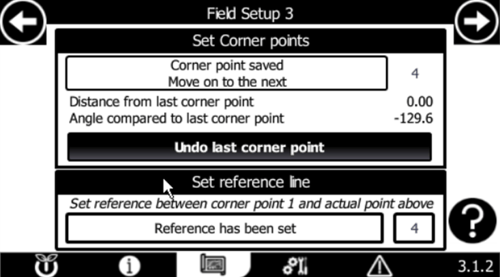 Lors de l'établissement de la ligne de référence, il convient d'opter pour une configuration qui minimise le nombre de tours nécessaires.Par exemple, si vous définissez la ligne de référence entre le point d'angle 1 et le point d'angle 2, toutes les lignes du champ seront parallèles à cette ligne.
