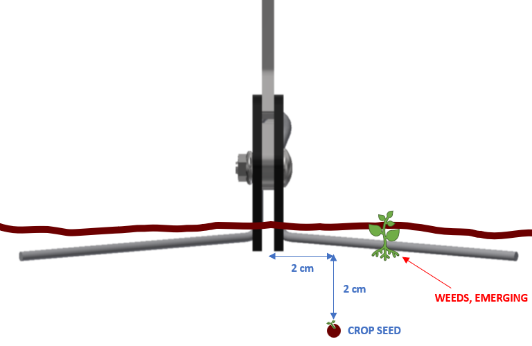 Als de onkruiddraad te diep wordt geplaatst in verhouding tot het huidige groeistadium van het gewas, kan dit de zaadlobben van het gewas beschadigen.