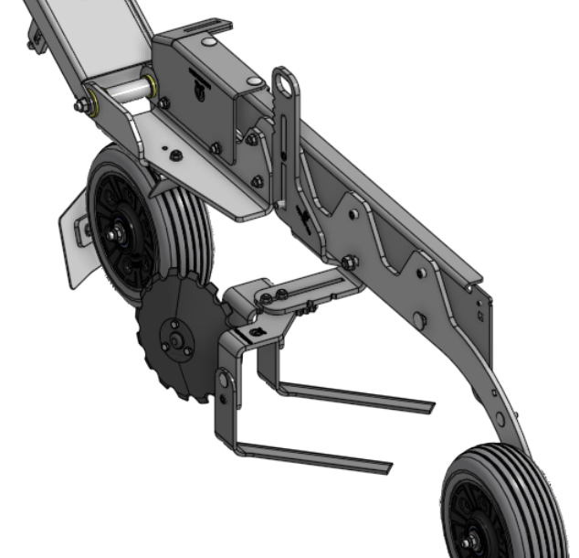 Hier zijn enkele problemen met de meest linkse rij. Onderdeelnummer 102011089 onkruid verwijdert slechts 15,5 cm vanaf het midden van de rij. Als er meer dan 31 cm tussen de rijen op de meest linkse rij zit, moet onderdeelnummer 102011089 worden vervangen door een passieve aanhanger gemonteerd met 102011088 om ervoor te zorgen dat de meest linkse rij tussen twee passages van de robot volledig wordt gereinigd. Anders blijft er tussen de meest linkse rij van twee passages een strook over die niet volledig is gewied.